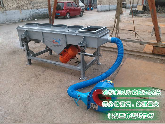 風冷式直線振動篩以DZSF系列直線振動篩為基礎,增加了風機降溫冷卻系統,可將高溫物料降溫后繼續篩分,有效的降低高溫物料的篩分難度,篩分效率、處理量也得到了大幅度的提高,節約生產成本。