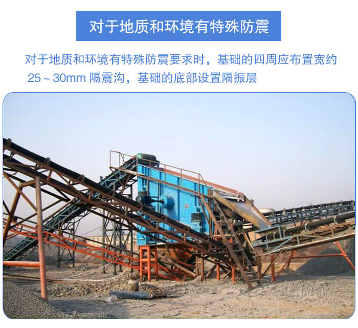 對于地質(zhì)和環(huán)境有特殊防震要求時,基礎(chǔ)的四周應(yīng)布置寬約 25~30mm 隔震溝,基礎(chǔ)的底部設(shè)置隔振層,基礎(chǔ)底部夯實之后,用水泥、煤渣、瀝青鋪設(shè)厚度約 200mm,在此隔振層上再澆灌混凝土。