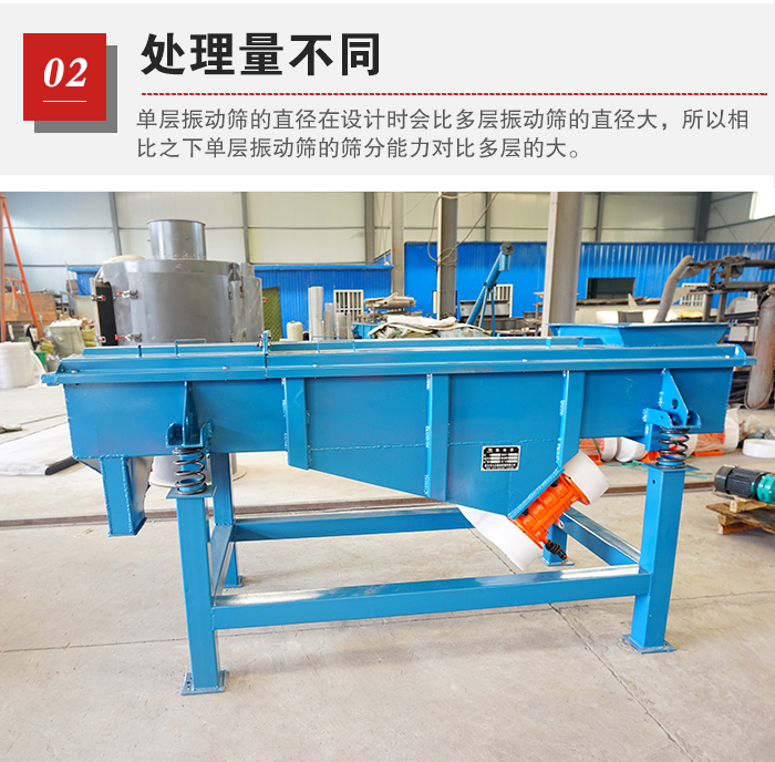 物料篩分產量是由篩網的直徑,也就是物料與篩網的接觸面積有直接關系的。而單層振動篩的直徑在設計時會比多層振動篩的直徑大,所以相比之下單層振動篩的篩分能力對比多層的大。