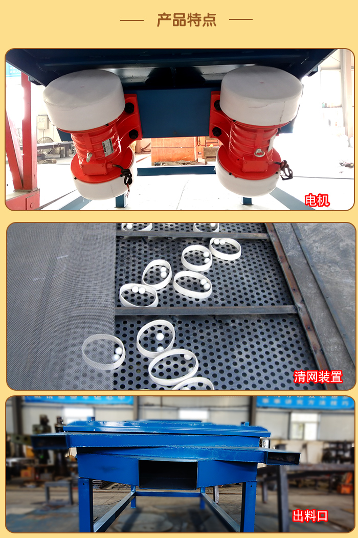 6、設備在停機時產生瞬間的共振區,此時振幅和噪聲會明顯增大,屬正常現象,設備在開停機前,篩面上不得有存留物料,篩網需經常檢查是否張緊、破損,如有破損要即時更換。