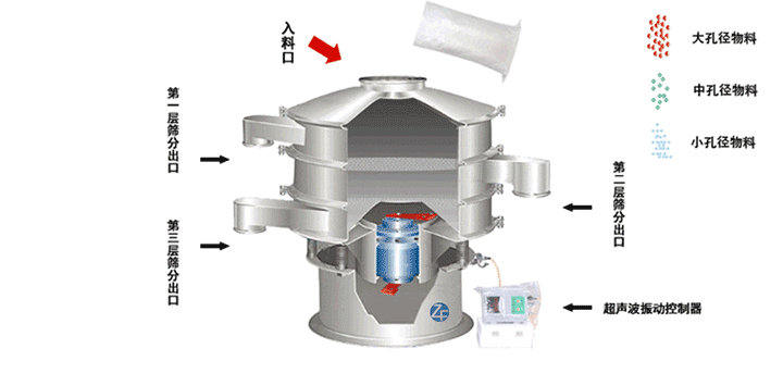 超聲波振蕩篩在直立式振動電機與超聲波換能器的共同作用下,實現(xiàn)物料的篩分/分級目的。直立式振動電機作為激振源,帶動物料和篩網(wǎng)的振動的同時,超聲波換能裝置實現(xiàn)對物料靜電,易聚團的抑制,保證物料的松散從而實現(xiàn)物料的篩分目的。